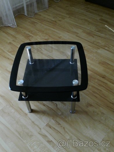 Pevný konferenční stolek o čtvercovém půdorysu. Na kovových nohách v barvě lesklý chrom a deskou v kombinaci čirého a černého skla.stabilní kovová konstrukce na 4 nohách, barva lesklý chromhorní deska z tvrzeného skla o síle 8 mm se zaoblenými tvary, z čirého skla, okraje z černě barveného sklarozměr horní desky 60×60 cmspodní odkládací deska z tvrzeného skla o síle 5 mm, černě barvené sklosvými rozměry se hodí i do menších prostorů
