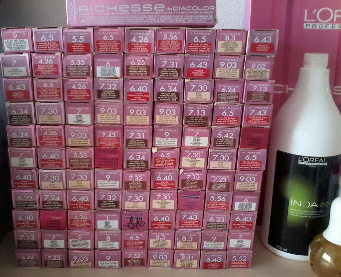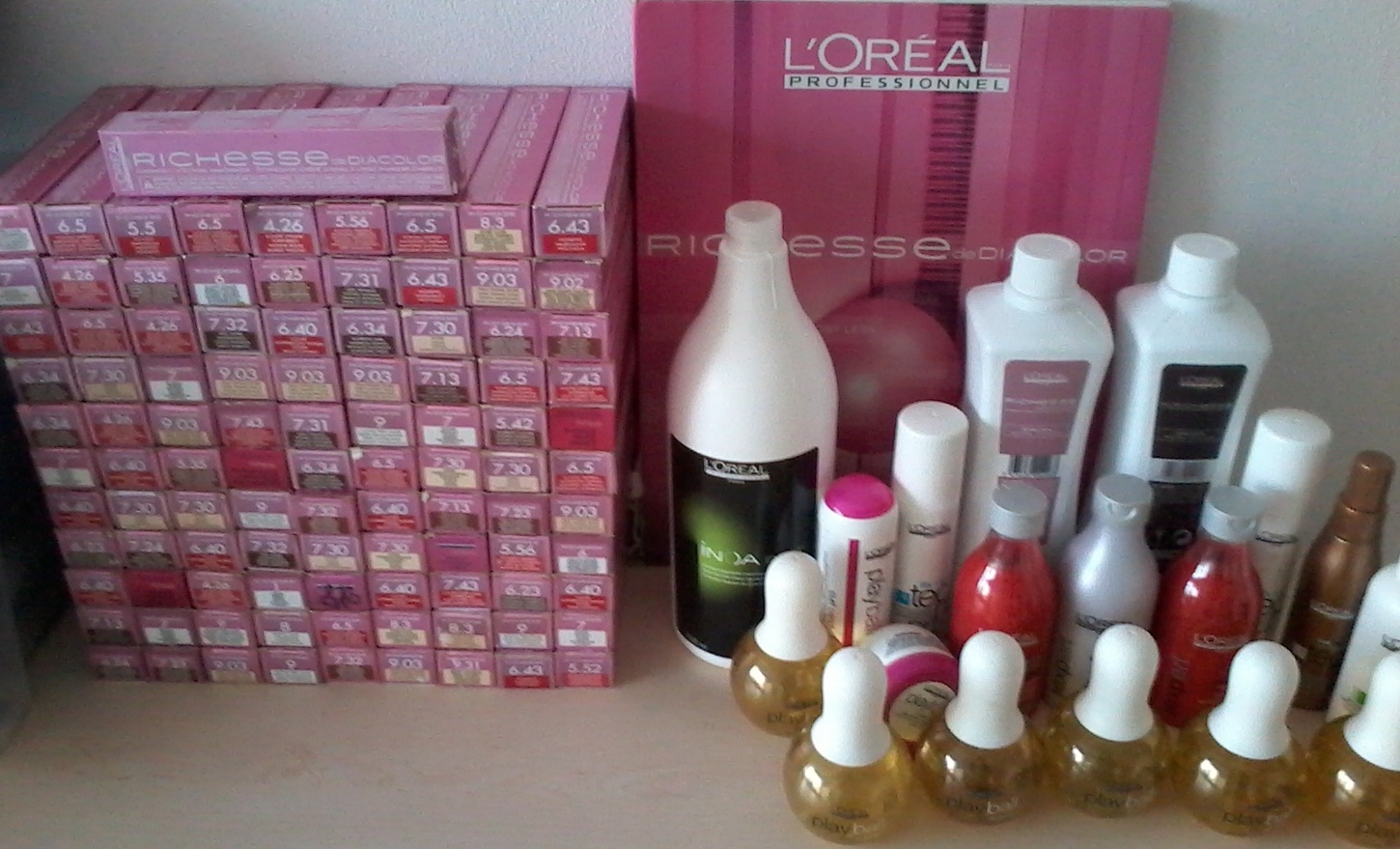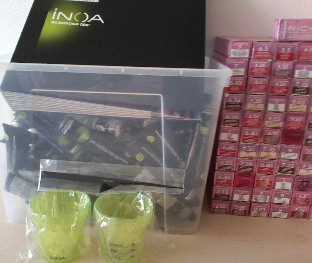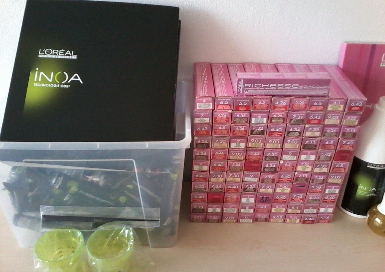 K prodeji nabízím paket barev Loreal Professionnel, který se skládá z: -90 ks barev Inoa ODS2 -100 ks barev Richesse de Diacolor -15 ks stylingových přípravků a péče Loreal - 1 ks Inoa Post šampon 1500 ml -2 ks oxidantů á 1000ml- 2 ks misek na barvení Inoa - 1 ks hřebínek Inoa. Vše je nové a nepoužívané. Inoa jsou bez krabiček, pouze tuby (tedy tak, jak je vidět z fotografií). Seznam odstínů mohu poslat mailem. V případě zájmu mohu přidat za příplatek i vzorníky. Prodám pouze jako komplet za cenu 10800Kč, což v přepočtu vychází na necelých 51Kč za kus!